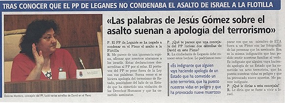 Más sangrante todavía fue el párrafo que dedicó a la concejal popular Dolores Montoro, que acudió al Pleno Municipal luciendo dos estrellas de David en solidaridad con Israel: "Lo podríamos comparar con que un miembro de ETA fuera a un Pleno con las fotografías de las personas que ha asesinado", es decir, que sólo apoyar a Israel en su batalla contra el terrorismo te convierte, paradójicamente, en terrorista.