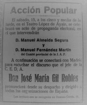 Almeida, algo incómoda quizá porque se había destapado al gran público una parte de su biografía que parecía que nunca se iba a destapar, soportó ironías como "menudo padre tenía Cristina, ¿eh?", "en las antípodas de tu manera de ser y de pensar, ¿no?". Otras frases suyas fueron: "...de mi manera de ser... no mucho, porque fundamentalmente era honrao". Y esto: "Me da igual que mi padre sea de derechas, si es una desgracia, como he dicho muchas veces, una desgracia la tiene cualquiera". En el diario HOY su padre publicó exactamente: "Las banderas del socialismo son de odio, destrucción y sangre, las de Acción Popular son de amor y de paz, son las de España; si veis que la fuerza pública no es suficiente para guardar el orden, poneos a su lado".