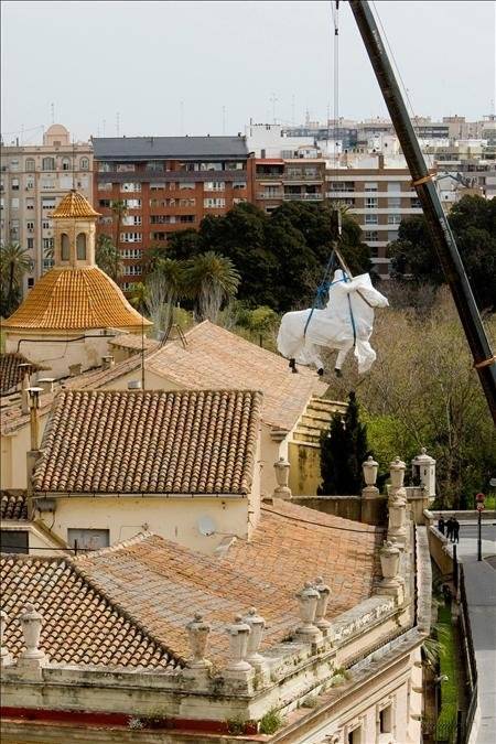 Los operarios han trabajado bajo la vigilancia de más de una veintena de agentes de las Fuerzas y Cuerpos de Seguridad del Estado y han precisado de una grúa para sacar la estatua del edificio.