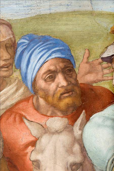 Según De Luca, que dirige las tareas de restauración pictórica de los Museos Vaticanos, en la pintura sobre la crucifixión de San Pedro aparece un personaje con un turbante azul que podría muy bien retratar a Miguel Ángel.