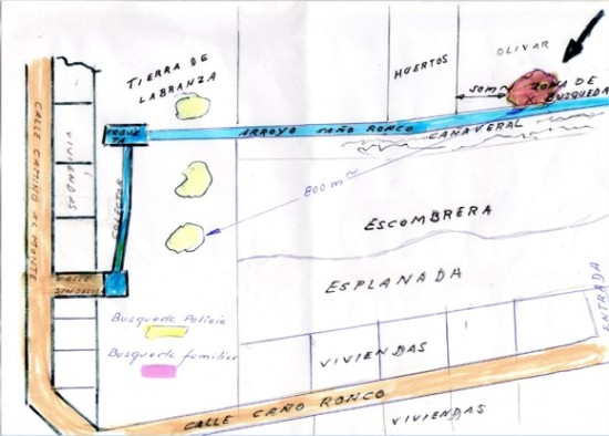 Este es el croquis del lugar que nos hizo el abuelo de Marta donde se advierte dónde buscó la Policía y cuál es la extensión donde hay que buscar para encontrar a Marta: