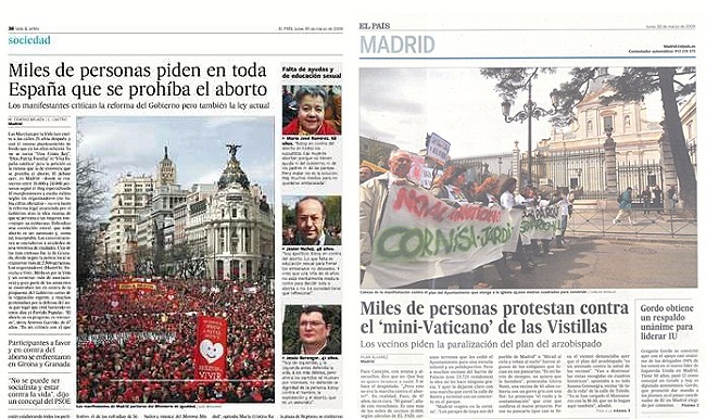En los periódicos distribuidos en Madrid ambas páginas forman un curioso conjunto informativo que deja en evidencia, una vez más, al rotativo de PRISA. Así, los titulares que se dedican a ambos actos cifran la asistencia en un idéntico "Miles de personas" , cuando los organizadores de la marcha por la vida han dado una cifra de asistentes por encima de las 500.000 y los de la protesta vecinal de sólo 8.000. Además, en el primer caso no se refiere sólo a la manifestación en Madrid sino a todos los actos celebrados en ciudades de toda España.