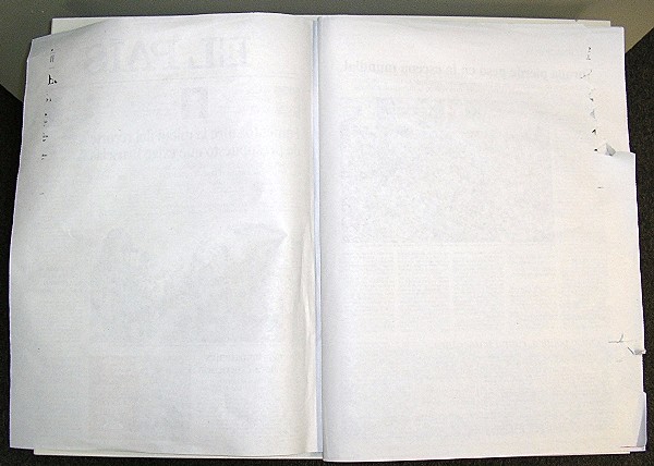 La primera de estas sorprendentes dobles blancas está entre la portada y la página dos del rotativo, por lo que sorprende al lector nada más empezar la lectura; el error se repite entre las páginas 11 y 12 y entre la 43 y la 44.