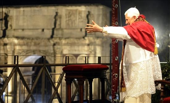 Como en años anteriores, Benedicto XVI presidió el Vía Crucis de rodillas desde la colina del Palatino, frente al Coliseo. En la última estación, la décimo cuarta, el cardenal vicario de Roma, Agostino Vallini, le entregó la cruz.