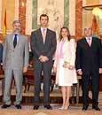 A su llegada, Don Felipe y su prometida fueron recibidos por los presidentes del Congreso, Manuel Marín, y del Senado, Javier Rojo, quienes los acompañaron hasta el vestíbulo de Isabel II del Palacio de las Cortes, donde firmaron en los libros de honor de ambas Cámaras. "Con nuestro más profundo respeto y afecto saludamos al Congreso de los Diputados en esta nuestra visita juntos previa a nuestro matrimonio", escribió Don Felipe en el libro de honor de la Cámara Baja, texto que también fue rubricado por Doña Letizia. En similares términos escribió el Príncipe unas líneas dedicadas al Senado, que Doña Letizia se limitó a firmar, siguiendo la costumbre de la Casa Real.