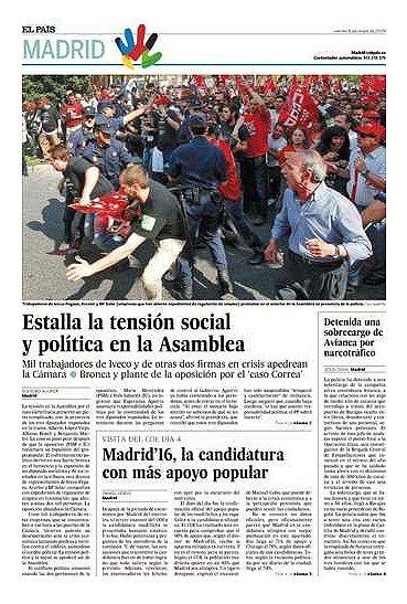 Pues bien, el diario de Prisa califica estos disturbios como un simple estallido de "tensión social y política en la Asamblea de Madrid". Los hechos no fueron condenados por la oposición, que si prefirió abandonar el pleno tras la expulsión de varios de estos trabajadores tras los insultos que profirieron contra Esperanza Aguirre e Ignacio González.