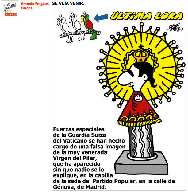 Junto a ella, un texto explica el presunto sentido humorístico de la viñeta: "Fuerzas especiales de la Guardia Suiza del Vaticano se han hecho cargo de una falsa imagen de la muy venerada Virgen del Pilar, que ha aparecido sin que nadie se lo explique, en la capilla de la sede del Partido Popular en calle Génova, de Madrid".