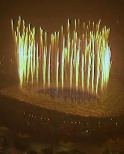 Las sucesivas explosiones trazaron una línea de luz en la noche en su camino al estadio. "Hubo huellas de fuegos artificiales", dijo Wang. "Algunas se produjeron en directo. Puede que se utilizaran otras de material grabado con anterioridad".