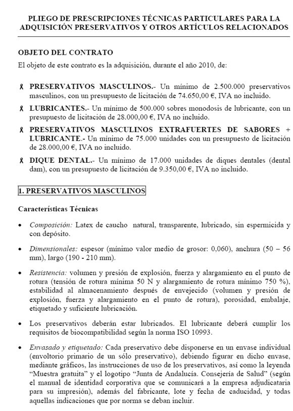 Los andaluces, en este caso los varones, pueden darse por satisfechos con la imagen que de ellos tiene la Junta de Andalucía. De hecho, en lo que se refiere a preservativos masculinos, los datos del pliego de condiciones son los siguientes: