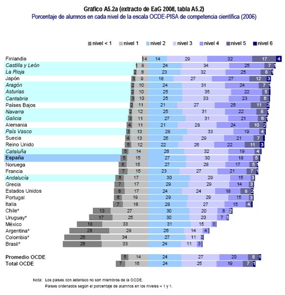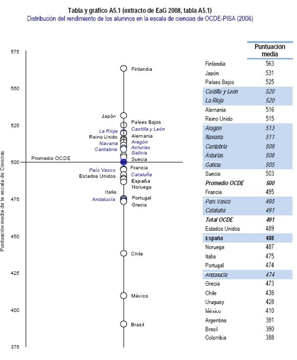 Los gráficos siguientes dejan bien claro cuál es el lamentable lugar que ocupaba la educación andaluza en el contexto internacional en 2008:
