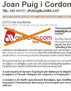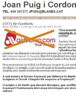 (Libertad Digital) En un nuevo texto del blog de Joan Puig conocido por calificar a Libertad Digital como la “prensa yihadista hispánica” y asaltar la vivienda familiar del director de El Mundo en Mallorca, el incendiario ex diputado de ERC ha continuado con su campaña de difamación contra la Air Berlin.