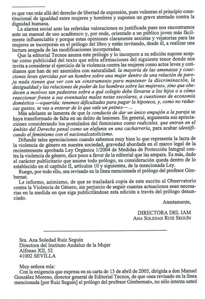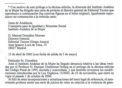 "Difundir tales apreciaciones cuando sabemos muy bien lo que representa la lacra de la violencia de género en nuestra sociedad, gravedad abordada en el marco legal de la recientemente aprobada Ley Orgánica 1/2004 de Medidas de Protección Integral contra la violencia de género, dice poco a favor de la editorial que las ampara. Es más, dado el carácter publicitario que asume todo prólogo, su consideración queda dentro de lo establecido en el capitulo n, artículos 10 y siguientes, de la mencionada Ley.