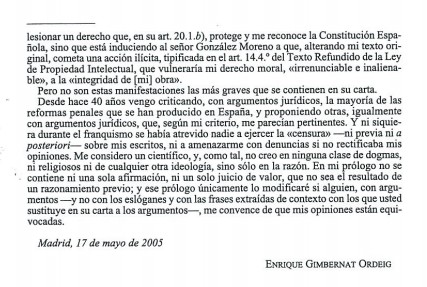 Gimbernat respondió a la directora general de este modo: "Desde hace 40 años vengo criticando, con argumentos jurídicos, la mayoría de las reformas penates que se han producido en España, y proponiendo otras, igualmente con argumentos jurídicos, que, según mi criterio, me parecían pertinentes. Y ni siquiera durante el franquismo se había atrevido nadie a ejercer la "censura" -ni previa ni a posteriori-sobre mis escritos, ni a amenazarme con denuncias si no rectificaba mis opiniones. Me considero un científico, y, como tal, no creo en ninguna clase de dogmas, ni religiosos ni de cualquier otra ideología, sino sólo en la razón. En mi prólogo no se contiene ni una sola afirmación, ni un solo juicio de valor, que no sea el resultado de un razonamiento previo; y ese prólogo únicamente lo modificaré si alguien, con argumentos -y no con los eslóganes y con las frases extraídas de contexto con los que usted sustituye en su carta a los argumentos-, me convence de que mis opiniones están equivocadas."