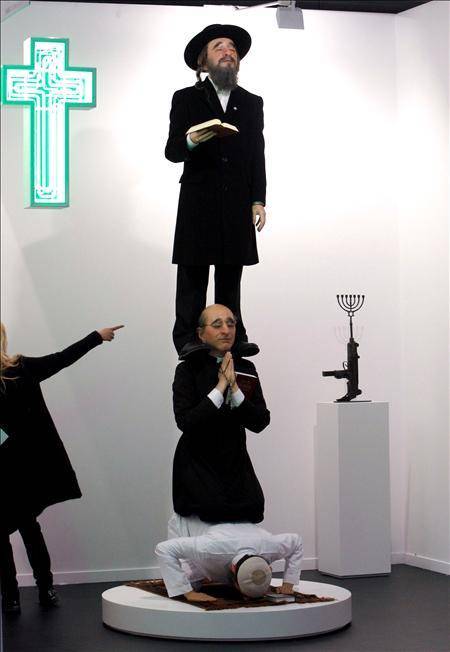La obra, de Eugenio Merino, tiene el nombre de "Starway to Heaven" y pretende ser una reflexión sobre la religión. Presenta a un musulmán, agachado, rezando sobre el cual están situados, de pie, un sacerdote y por encima, un rabino. Pero la imagen más grave es la de una pistola de la que salen los siete brazos de la Menorá, el candelabro sagrado para los judíos. Vendida ya por 5.000 euros, la obra ha suscitado el malestar de la Embajada de Israel.