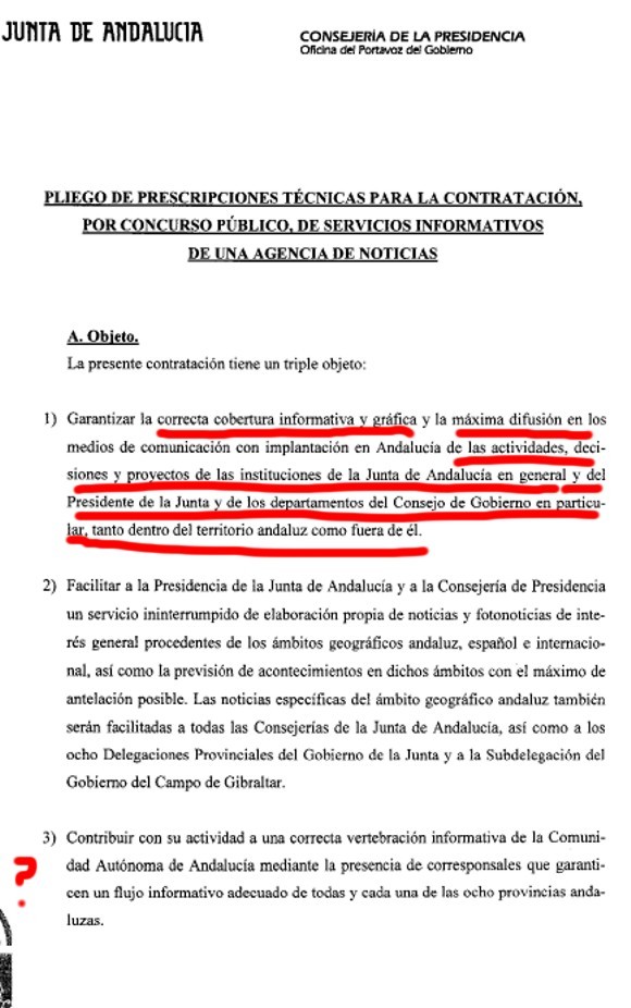 Dado que la obligación de estas agencias de noticias de ámbito nacional y autonómico es informar al público con veracidad y rigor de todo lo que sea realmente una noticia, cabe preguntarse qué sentido tiene este contrato. ¿Es que la Junta de Andalucía premia a estas Agencias por hacer lo que deberían hacer por obligación profesional? ¿O es el que un protocolo oculto de condiciones las obliga a tratar de modo especial las noticias que tengan que ver con la Junta y con su presidencia o a elaborar noticias especiales o cualquier otro contenido?