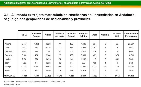 Vean cuál es la composición por origen de los alumnos inmigrantes andaluces según la propia Consejería de Educación de la Junta de Andalucía: