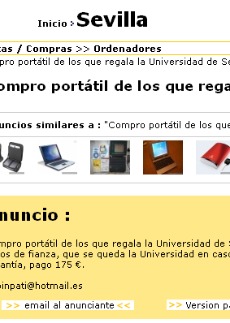 LD (Pedro de Tena) La Universidad se queda con los 100 euros de fianza. El estudiante que lo vende gana 75 euros ya que recupera la fianza que pagó más 75 euros y el comprador revende el ordenador a 300 o 400 euros, precio competitivo. Es la consecuencia de la "generosidad" de quienes queriendo ofrecer casi todo gratis a los alumnos favorecen la irrupción de los piratas de la red, reventas y especuladores que hacen su agosto con el dinero público, que es el que paga los ordenadores que se mal gestionan por 100 euros y no siempre. Eso sí, la Universidad de Sevilla no está ni se le espera entre las primeras Universidades de España y de Europa.
