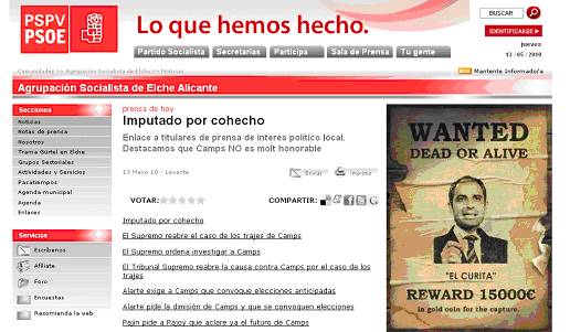 La página web de la Agrupación Socialista (PSPV-PSOE) de Elche recoge un montaje del conocido y tradicional cartel del Lejano Oeste "Wanted Dead or Alive" -Se busca muerto o vivo-, en el que figura la imagen del presidente de la Generalitat, Francisco Camps.