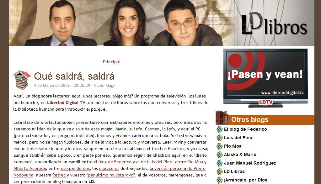 (Libertad Digital) En la primera anotación, que lleva por título "Qué saldrá, saldrá", Víctor Gago dice que su objetivo, y el de sus compañeros, es "ir de la vida a la lectura y viceversa"; "leer, vivir y conversar" con los lectores "sobre lo uno y lo otro, ya que en la tele sólo hablamos el trío Los Panchos, y ya cansa".