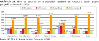 Estos datos, dice el informe, contradicen poderosamente el tópico que asocia un menor nivel de desarrollo socio-económico del país de origen a un menor nivel educativo de las personas procedentes de esos países. Si bien las diferencias entre los niveles educativos de distintos conjuntos geopolíticos de procedencia son muy notables y, además, parecen guardar cierta relación con el nivel de desarrollo económico de dichos países, es reseñable el hecho de que sólo uno de los cinco conjuntos geopolíticos aquí distinguidos se quede en valores inferiores a los de la población española de Andalucía.