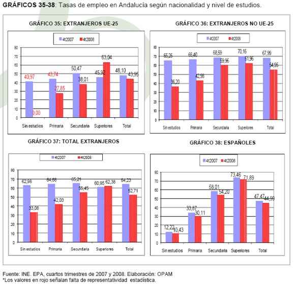 De todos modos e indiscutiblemente, dice el informe, para los españoles y, en menor medida, para los extranjeros de la UE-25, la probabilidad de estar ocupados aumenta en función del nivel educativo, mientras que en el caso de los demás extranjeros esta correspondencia no es tan clara: a finales de 2007, se observan tasas de empleo relativamente altas incluso entre quienes no tenían un nivel educativo medio-alto o alto.