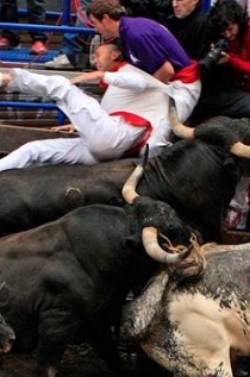 LD (Efe) Con un pavimento húmedo debido a la lluvia caída durante la noche e incluso con algunas gotas minutos antes de que comenzara el encierro, y con dificultades de los agentes de la Policía Municipal para contener a los corredores, el séptimo encierro ha contado con la presencia de los de Miura, ya clásica en los domingos sanfermineros debido a su tradicional nobleza.