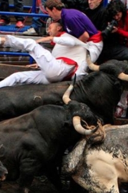 Así, con varios mozos pisoteados y algún montón de corredores que los toros han tenido que saltar para poder continuar su camino, la manada ha entrado escalonada en el callejón de la plaza precedida de carreras muy apretadas, e incluso de trompicones, que han motivado la formación de un pequeño montón a la izquierda.