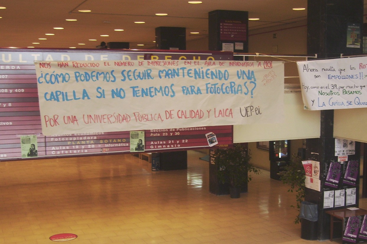 Los laicistas que exigen el cierre usan el peregrino argumento de "cómo no puede haber dinero para fotocopias y sí para mantener una capilla". Sin embargo, los estudiantes católicos denuncian que las asociaciones de estudiantes, alguna de las cuales pide el cierre, también tienen sus locales con línea telefónica incluida a costa de la universidad.
