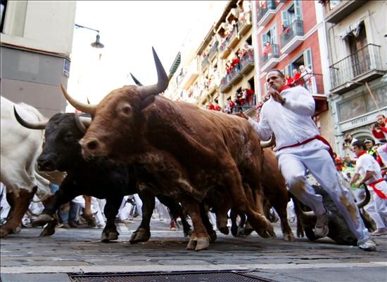 Saliendo de la plaza del Ayuntamiento, se vivió uno de los momentos más espectaculares del encierro, cuando un mozo cogió a la manada por la parte izquierda de la calle Mercaderes, tomó la curva guiando a los toros también por la izquierda evitando ser aplastado contra el tablado y siguió la carrera por la calle Estafeta, hasta que tuvo que apartarse por el veloz ritmo que marcaba el grupo.