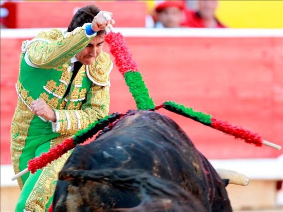David Fandila El Fandi, de Granada, de verde y oro. En el segundo, un toro con complicaciones y que apretaba mucho, El Fandi, en banderillas, le ha puesto dos pares de poder a poder y uno al violín, tragando mucho. Brindó al público, se fue a los medios y a un toro que rompió a embestir le pegó cinco redondos de rodillas, seis series sobre ambas manos muy templadas y con muletazos muy largos, exhibiendo mucho poder con el toro. Cerró la faena con circulares invertidos y muletazos, al igual que empezó con las dos rodillas en tierra. Mató de un cañonazo, cotando dos orejas de ley. En el quinto, francamente bien con el capote y las banderillas, pero el toro que había sangrado mucho en la suerte de varas se rajó. Escuchó una gran ovación, al final de la corrida salió a hombros.