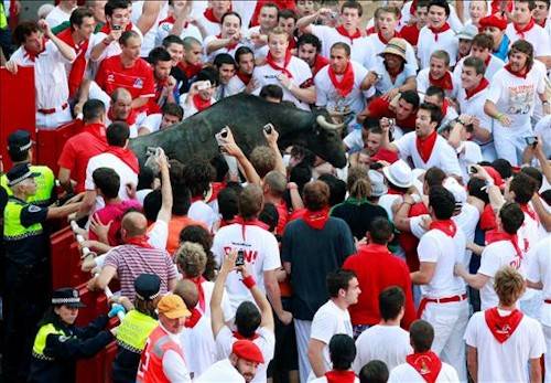 La manada ha recorrido la calle Estafeta dividida a veces en dos grupos y otras en tres, lo que ha permitido a los corredores intercalarse entre los animales y realizar carreras muy vistosas, de larga duración, y lucirse así ante las astas, pero también ha habido imprudentes que han agarrado a los toros por los cuernos y les han tocado el lomo, aunque sin que los morlacos se fijaran en ellos.