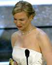 La rubia actriz competía en esta edición como mejor secundaria frente a Shohreh Aghdashloo ("Casa de arena y niebla"), Patricia Clarkson ("Pieces of April"), Marcia Gay Harden ("Mystic River") y Holly Hunter ("Thirteen 13"). En la épica y romántica "Cold Mountain", el papel de Zellweger dista mucho de ser protagonista en cuanto al tiempo en la pantalla, pero desde que entra en cámara su presencia hace que lo demás importe poco. "Es una persona muy práctica, una superviviente que sólo utiliza su imaginación para resolver problemas", describe la actriz sobre su personaje, contrapunto en esta historia de una romántica y lánguida Nicole Kidman.