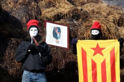 La foto muestra el retrato robado colgado boca abajo en un pajar, junto con dos jóvenes que la custodian disfrazados con unas máscaras y "armados" con una hoz y un fuet con la que dibujan un símbolo similar a una hoz y un martillo, según informa Europa Press.