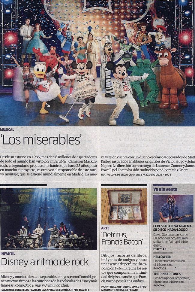 Público tiene un día particularmente escuálido (48 paginitas solamente) y que sería bastante aburrido de no ser por una inocentada que la maquetación les ha jugado a los propios periodistas: la pequeña nota editorial sobre Los miserables y la de Disney a ritmo de rock han intercambiado sus fotografías de forma que el clásico musical basado en la obra de Víctor Hugo aparece protagonizado por Mickey, Donald y demás pandilla. Vean, vean:
