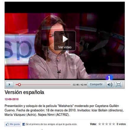 Y eso que en la información del vídeo en la propia web de TVE figura otro título: Mataharis de la directora Iciar Bollaín. Tal y como menciona el blog anvazher.nireblog, debió tratarse de algún tipo de cambio de última hora, ya que la película programada para este sábado no era Una palabra tuya, escrita y dirigida por Sinde a partir de una novela de Elvira Lindo.
