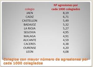 De hecho, por colegios médicos, el de Jaén encabeza el ránking por delante de Cádiz , Castellón (5,49), Badajoz (5,32), La Rioja (5,27), Segovia (4,95), Málaga (4,91), Alicante (4,59), Cáceres (4,38), Ourense (4,20) y León (4,08). Por ejemplo en Cádiz esta cifra subió, ya que a lo largo del pasado año 2010 se asistieron en la provincia un total de 34 casos de agresiones a facultativos. Comparado con el año 2009 supone un ligero aumento, ya que entonces se produjeron 30.