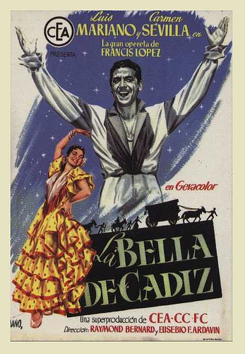 La opereta La Bella de Cádiz, de Francis López, fue llevada al cine en 1953 por el director francés Raymond Bertrand. Protagonizada por Luis Mariano (El prícipe de la opereta) y Carmen Sevilla, que interpreta a María Luisa, una gitanilla que cuativa con su belleza Carlos, el personaje de Luis Mariano.