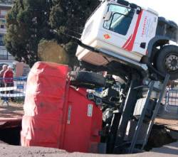 El socavón se ha tragado casi el remolque por completo, mientras que la cabina ha quedado suspendida en el aire y el conductor "sólo se ha llevado un buen susto", según las fuentes policiales.