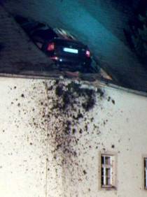 El hombre ingresó en un hospital cercano con heridas graves. " Para el automóvil la rampa se comportó como una pista de salto de esquí ", explicó Knut Wagner, de la dirección policial de Chemnitz. El tejado resultó fuertemente dañado y el coche tuvo que ser extraído con una grúa.