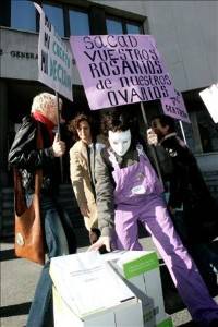 Entre las festivas pancartas se podían leer cosas como "sacar vuestro rosarios de nuestros ovarios". El aquelarre abortista fue convocado por más de setenta organizaciones feministas y sindicatos. Según informa la agencia Europa Press representantes de estos grupos presentaron 4.000 autoinculpaciones por haber abortado, dentro de la campaña "Por el derecho de las mujeres a decidir", en solidaridad con las mujeres llamadas a declarar por presuntos abortos ilegales y para solicitar que se cambie la legislación que protege la vida de los no nacidos.