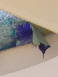 El suelo de la sala está recubierto con plásticos lo que lleva a pensar que, en efecto, parte de la cúpula y la pintura se están desprendiendo.