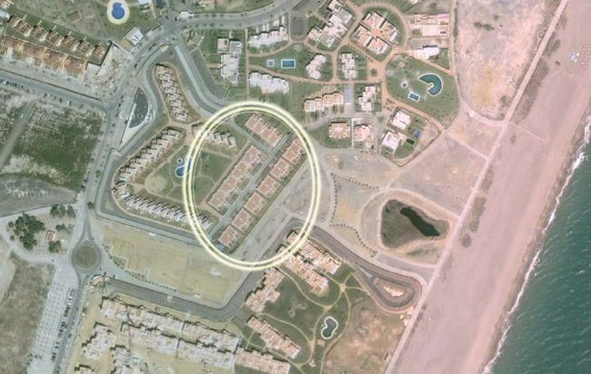 Se trata de un adosado de una sola planta, que ronda los 100 metros cuadrados, con tres habitaciones y dos baños. También tiene jardín, terraza y porche. Se encuentra ubicado en la pequeña urbanización 'El Mirador de Vera', una hilera de chalés y apartamentos en primera línea de la zona naturista de la localidad, como puede apreciarse en la imagen.