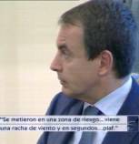 En el informativo de TVE se dijo que el presidente había hablado del incendio en la reunión. Telecinco tuvo mejor oído y reflejó qué era lo que Zapatero le decía a Sanz mientras posaban. Gracias a los subtítulos que ofreció la cadena privada (en la foto), se entendieron lo que son sus primeras palabras sobre la tragedia de Guadalajara: "Se metieron en una zona de riesgo, viene una racha de viento y, en segundos, plaf".