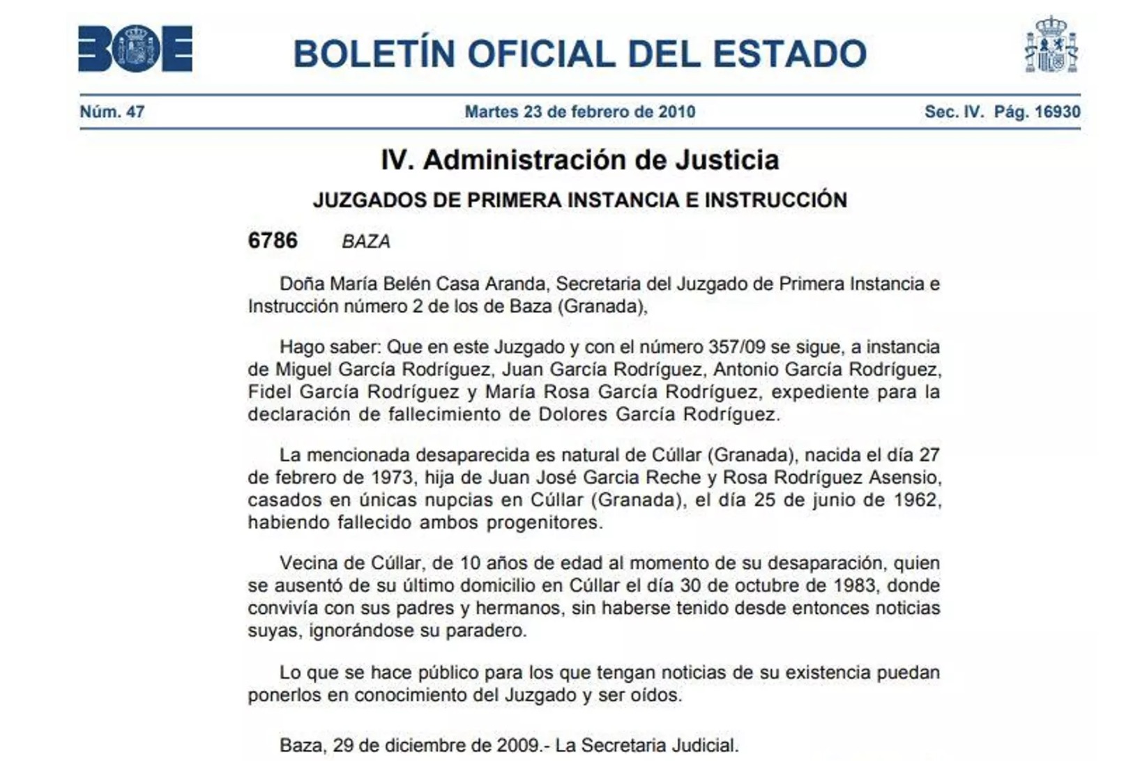 La desaparición de Dolores García Rodríguez ocurrió el 30 de octubre de 1983. Pese a los esfuerzos de búsqueda realizados en la comarca, nunca se obtuvieron pistas sobre su paradero. Con el paso de los años, su familia, compuesta por cinco hermanos tras el fallecimiento de sus padres, inició los trámites legales para declarar su fallecimiento. Así quedó recogido en el Boletín Oficial del Estado del 23 de febrero de 2010, donde se describía que la niña desapareció en Cúllar y desde entonces no se tuvieron más noticias sobre ella.