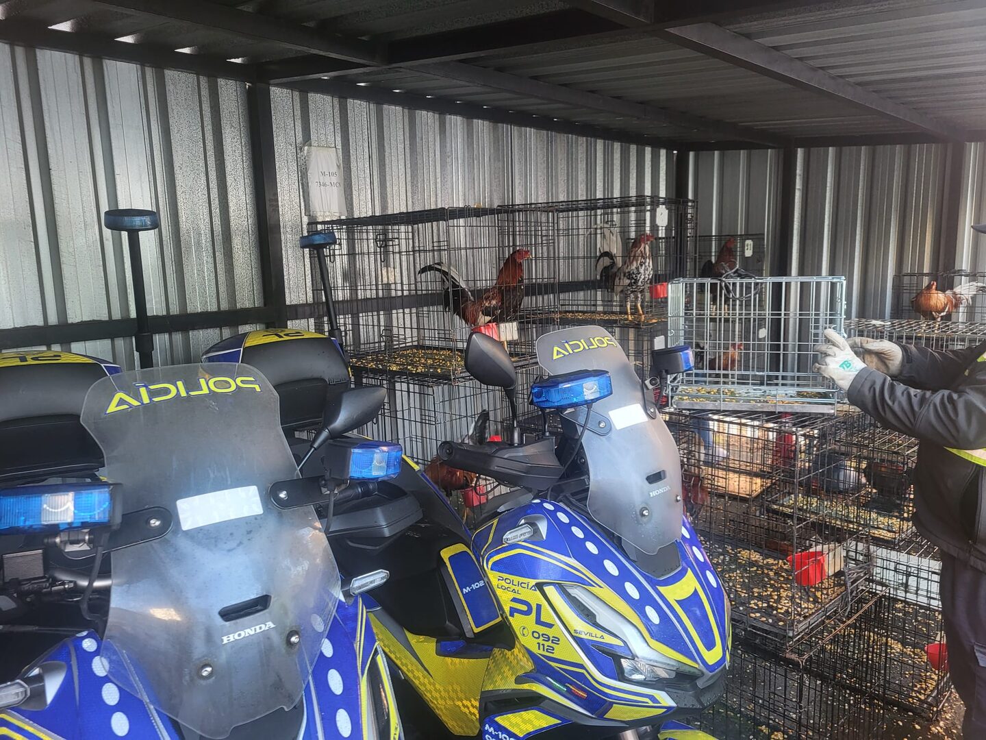 Los agentes de la Policía Local de Sevilla se encontraron este domingo en la comisaría del Distrito Sur una pelea de gallos. El día anterior, los cuerpos policiales habían realizado una operación en las Tres Mil Viviendas, interviniendo veinte gallos de pelea más otros dos muertos. Ante la falta de servicio servicio de recogida de animales de Sevilla trasladaron a los animales en cajas de cartón a la comisaría para ser trasportados al Zoosanitario, ya que este servicio no está disponible los fines de semana.