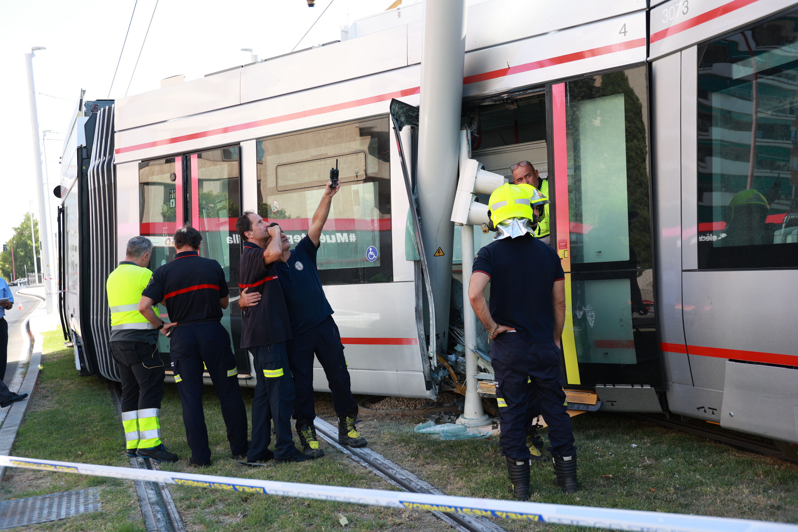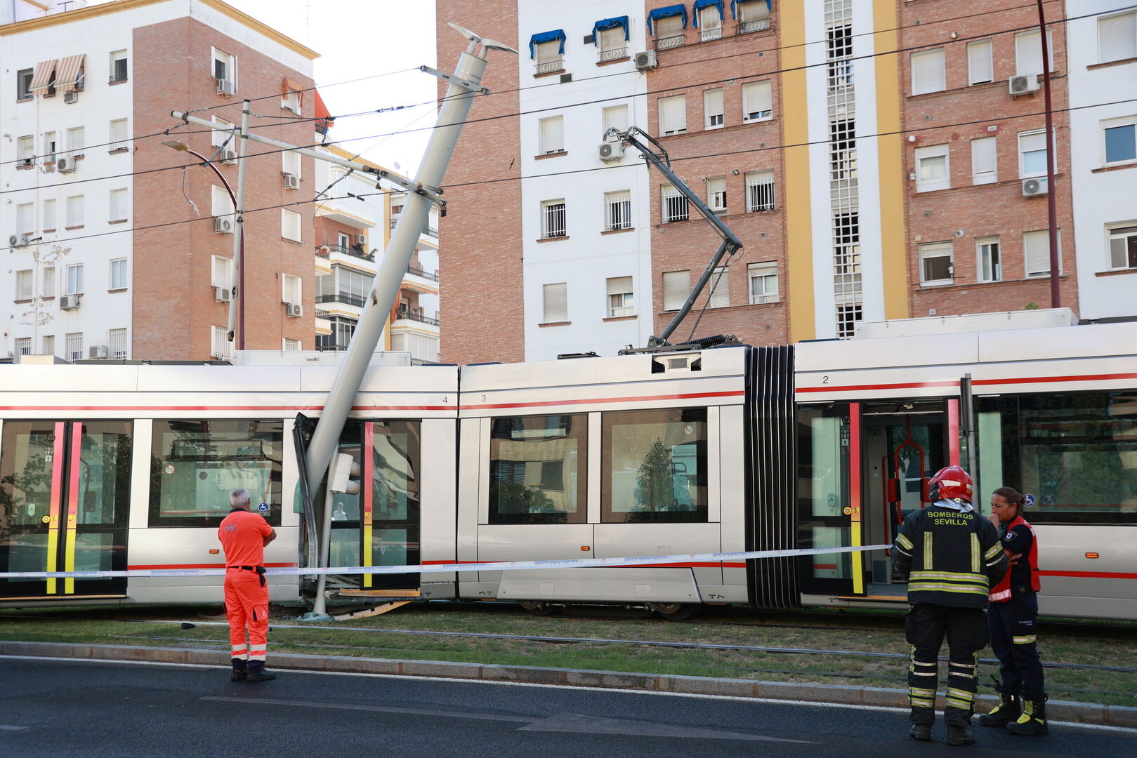 Tras el impacto contra la catenaria, se produjo un cortocircuito que originó un fuego en uno de los vagones. Testigos del accidente alertaron al 112 de Andalucía, lo que movilizó de inmediato a efectivos de Bomberos de Sevilla, Policía Local, Policía Nacional y servicios sanitarios preventivos. Antes de su llegada, algunos empleados de comercios cercanos, junto con pasajeros, intentaron sofocar el incendio con extintores.