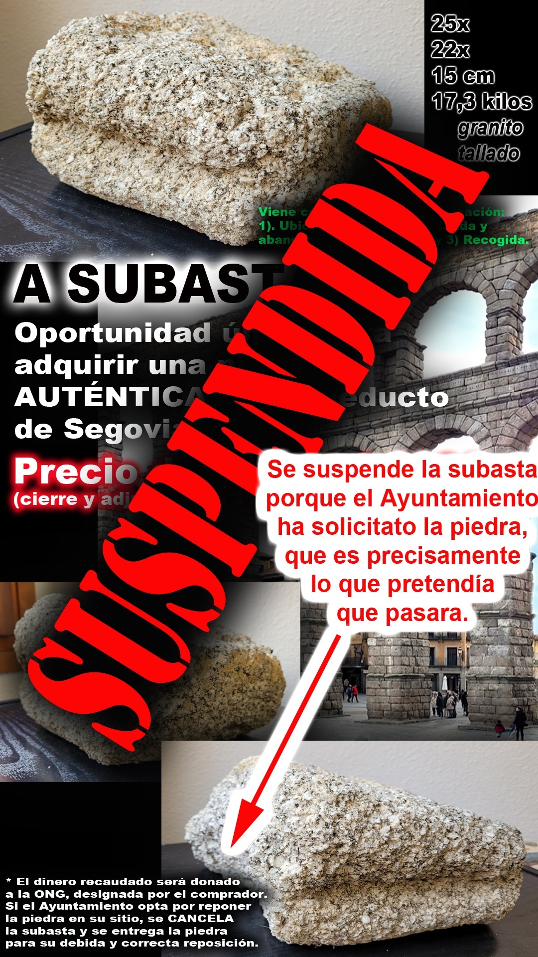 "A subasta. Oportunidad única de adquirir una piedra auténtica del Acueducto de Segovia". Con este mensaje publicado en sus redes sociales, un vecino de Segovia anunciaba que ponía a la venta un bloque de granito que, según aseguraba, formaba parte de uno de los últimos arcos del emblemático monumento. Por 1000 euros, el individuo pretendía vender el pedrusco.
