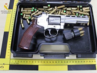 Tras obtener autorización judicial, la Guardia Civil efectuó el registro del domicilio en la madrugada del 28 de julio. Los agentes hallaron dos revólveres, una pistola, una escopeta calibre 12, munición, 47 gramos de cocaína y material para su preparación, además de varios dispositivos informáticos. En ellos se localizaron grabaciones de la víctima y de exparejas anteriores. Las armas estaban modificadas y carecían de licencia.