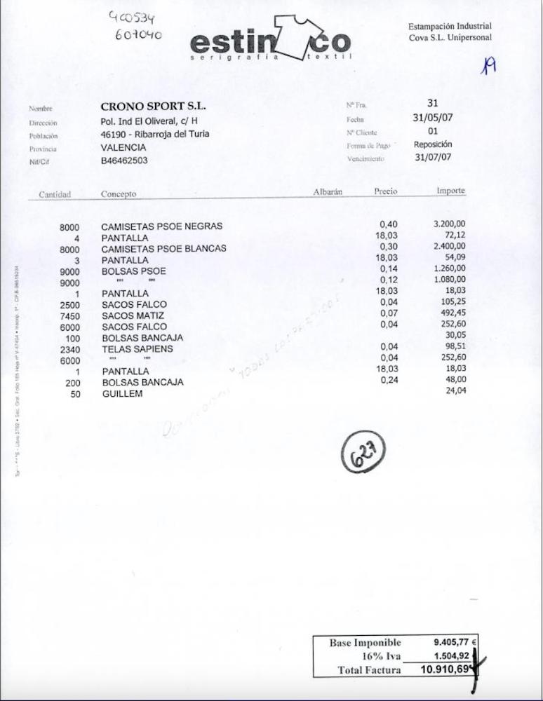 Aclarado ese punto, la UCO ha certificado un asunto especialmente delicado para el PSOE. Y es que, ante la evidencia de que las camisetas y demás productos existieron y se pagaron, "entre la documentación presentada por parte del PSPV-PSOE ante el Tribunal de Cuentas en relación a las elecciones municipales celebradas en el año 2007, no se encuentra ningún gasto relativo a la mercantil Cronosport SL." Traducido: no hay ninguna factura que pueda justificar unos gastos similares.