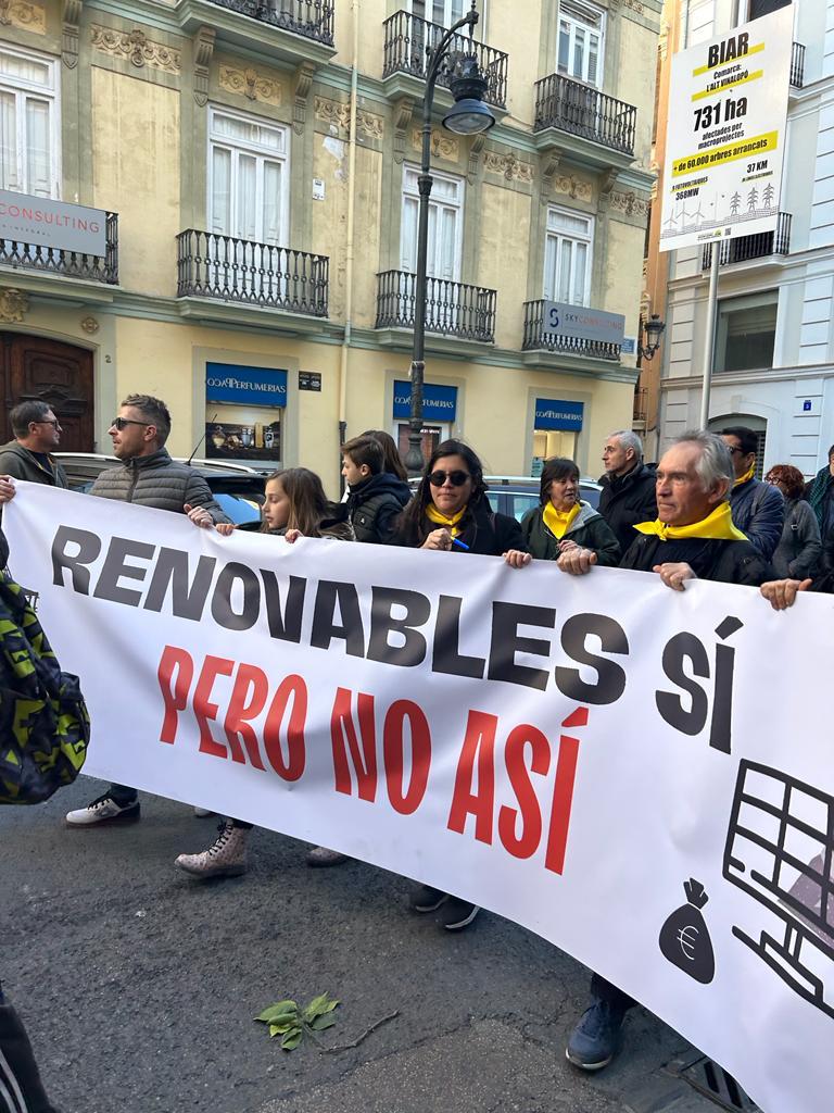 Hoy, más de 40 asociaciones de municipios de toda la comunidad autónoma se han citado en Valencia en una manifestación que ha reunido a unas 5.000 personas en favor de una transición energética justa que no destruya el campo y los bosques del interior, y para mostrar su disconformidad contra los macroparques eólicos y solares que están destruyendo la forma de vida de los pueblos, el paisaje y la agricultura y pedir un modelo de transición energética "justo".